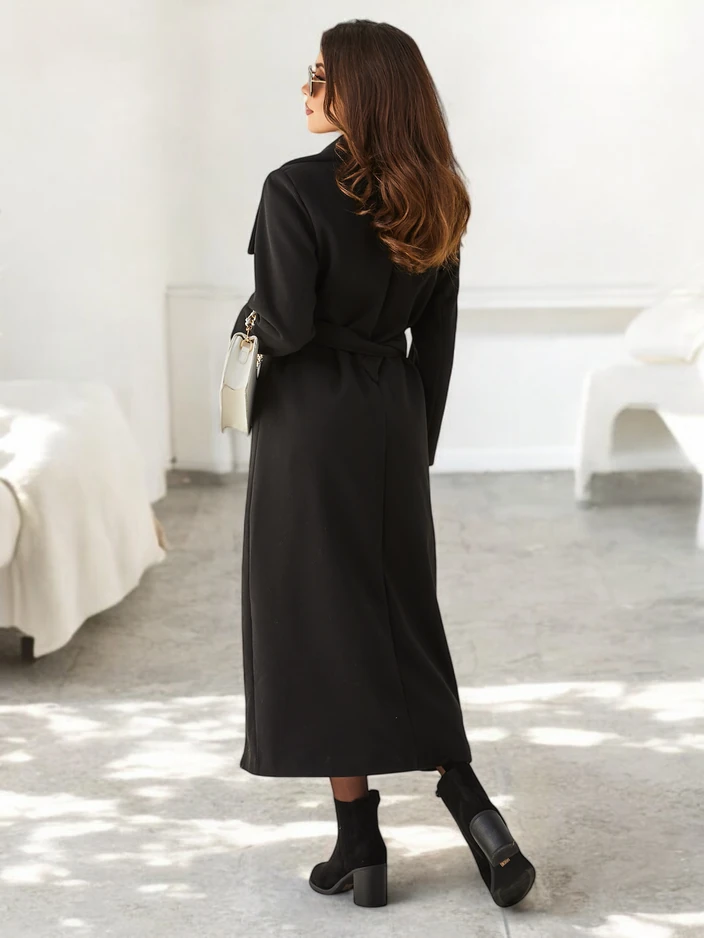 • Večni ženski plašč do gležnjev s pasom na pasu. Model ima dolge rokave in gumbasto zapiranje. Ima podlogo. Idealna izbira za jesen! OPOZORILO: Natančnost meritev (+/-) 1 cm. Dimenzije merjene v ležečem položaju.