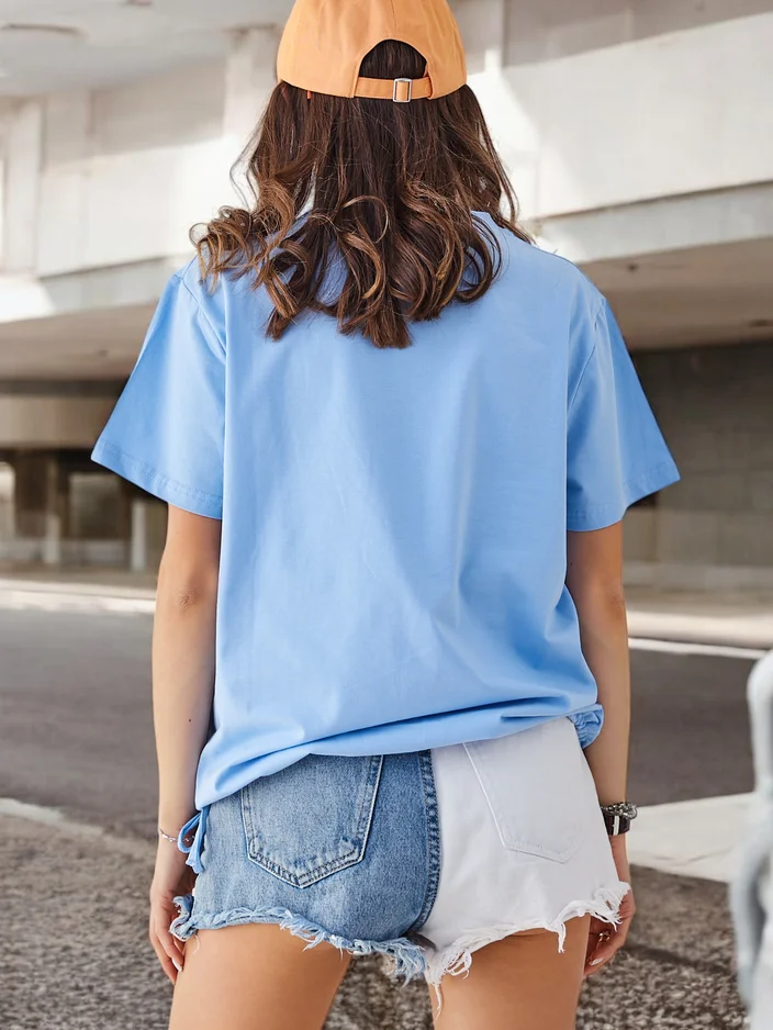 - Originalna ženska bluzica z okroglim izrezom, izdelana iz mehkega in prijetnega materiala. Celoten kos je okrašen z diskretnim napisom, kratki rokavi pa dodajajo lahkotnost. Odlična izbira za ustvarjanje modnih in stilskih oblačil!