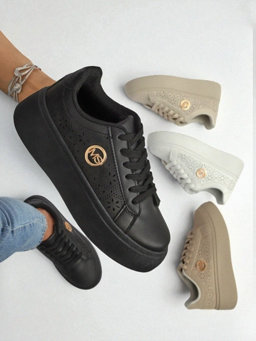 - Ženski mrežasti športni copati iz eko usnja in tekstilnega vložka na platformi, ki združujejo udobje z modnim slogom. Idealni za vsak dan, zagotavljajo lahkotnost in udobje, subtilen dizajn pa doda eleganco vsaki kombinaciji.