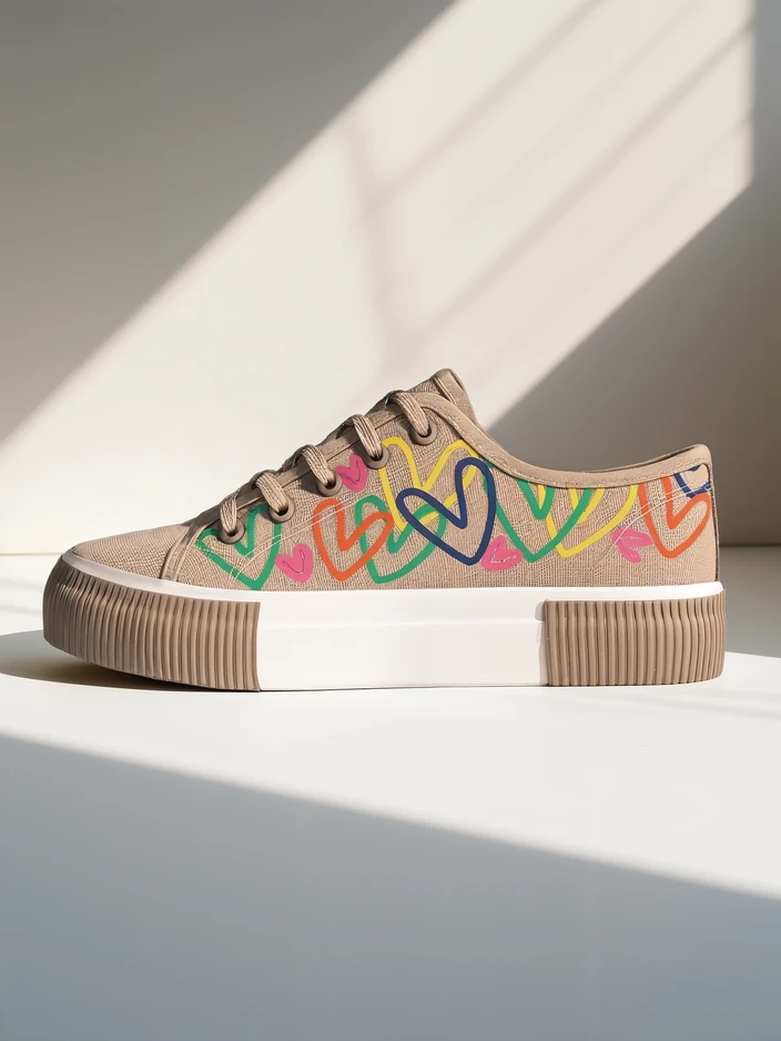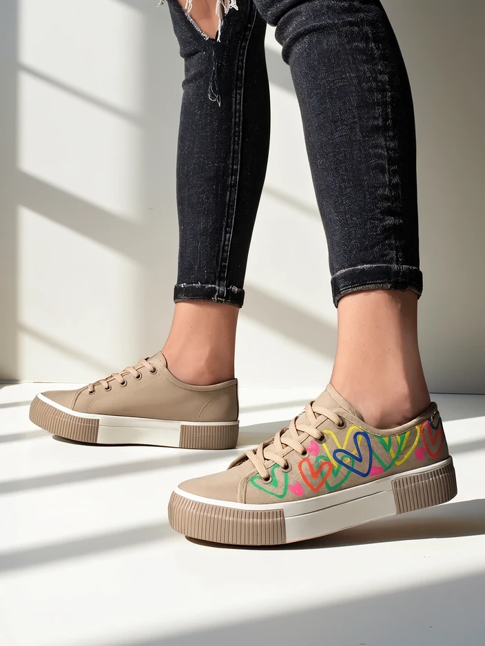 - Ženske športne copate izdelane iz tkanine. Zgornji del je vezan in okrašen s printom srca. Podplat je klasična gumijasta. Ti čevlji bodo odlični za vsakodnevno nošenje!