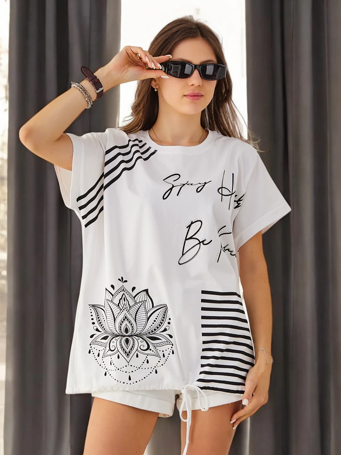 - Ženska bombažna majica je lahka in udobna izbira za vsak dan. Navdihnjena z pozitivnim sloganom, je popolna za sproščene sloge. Mehka tkanina zagotavlja udobje, minimalistična zasnova pa jo naredi primerno za različne outfite.
