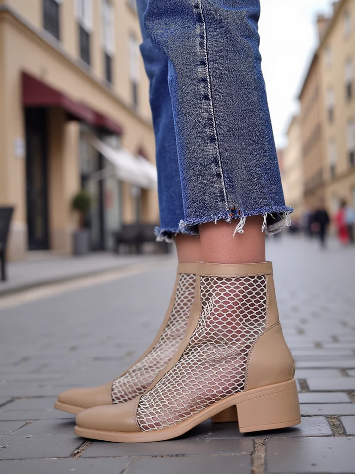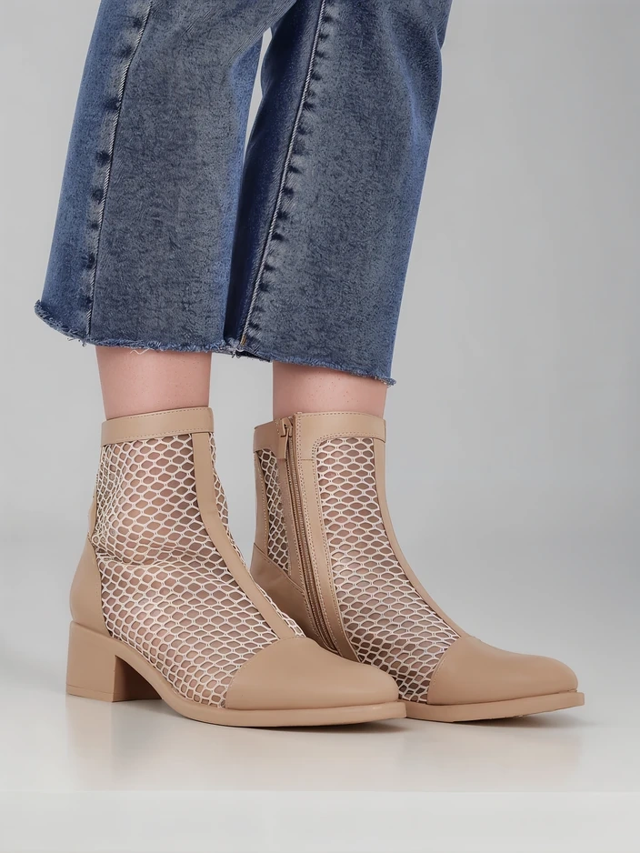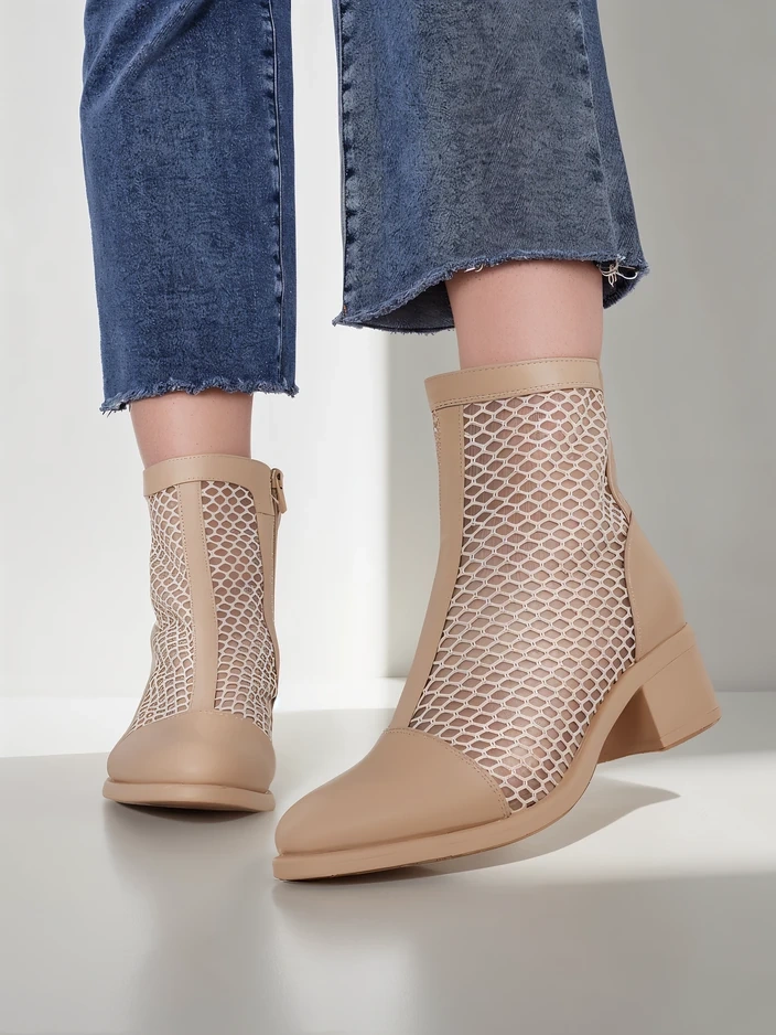 - Edinstveni ženski gležnarji iz mrežaste tkanine in ekološke usnje z perforiranim zaključkom in ekološko usnjeno podplatom. Model je zaprt z zadrgo. Popolni za jesenske obleke!.