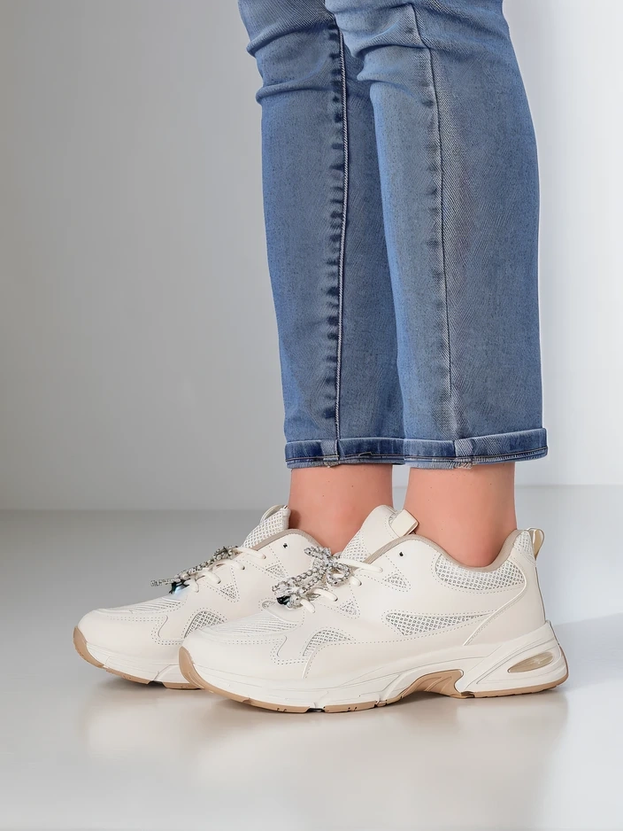 - Ženske športne čevlje iz ekološke usnje in mrežastega materiala. Model z debelejšim podplatom. Zavezovanje zgornjega dela. Idealne so za vsakodnevne kombinacije! Okrašene z odstranljivo verigo.
