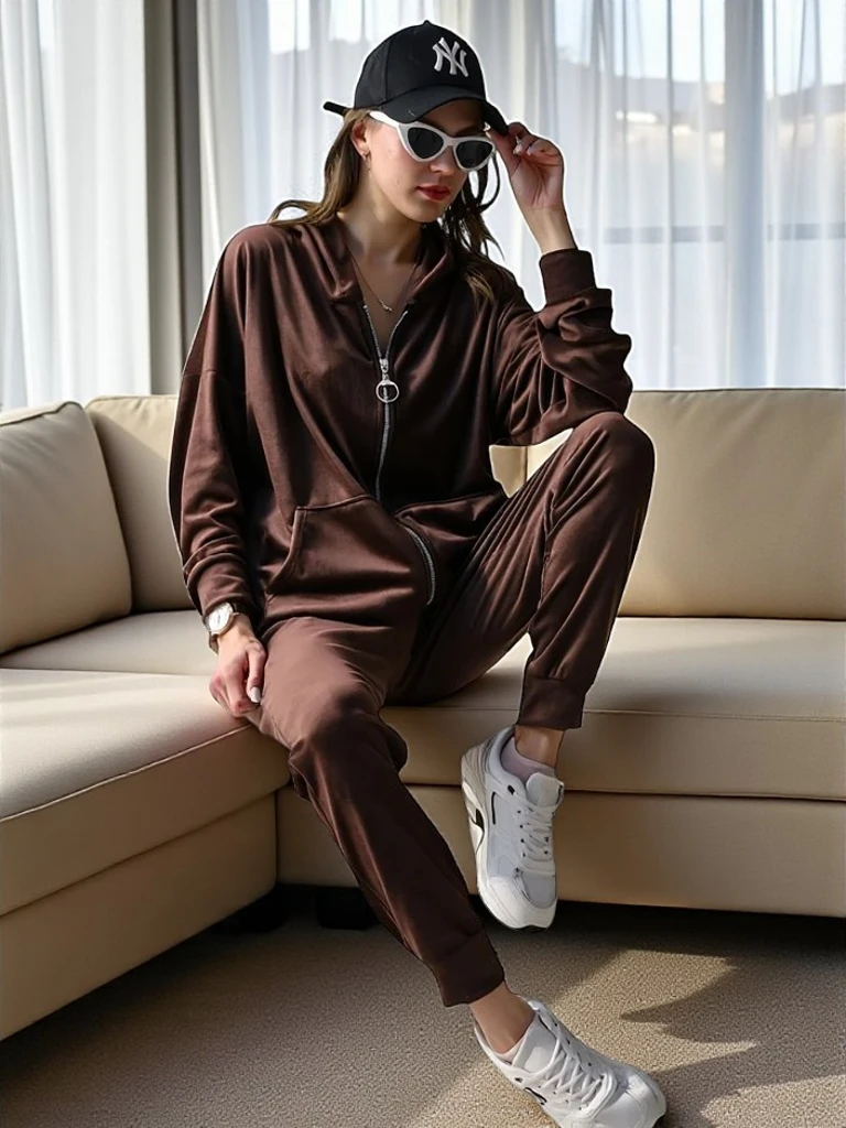 - Ženski set a'la žamet, izdelan iz prijetnega materiala. Zip-up kapuca s hoodie. Dolge hlače z elastičnim pasom, 2 žepa. Čutite stil v tem čudovitem setu!