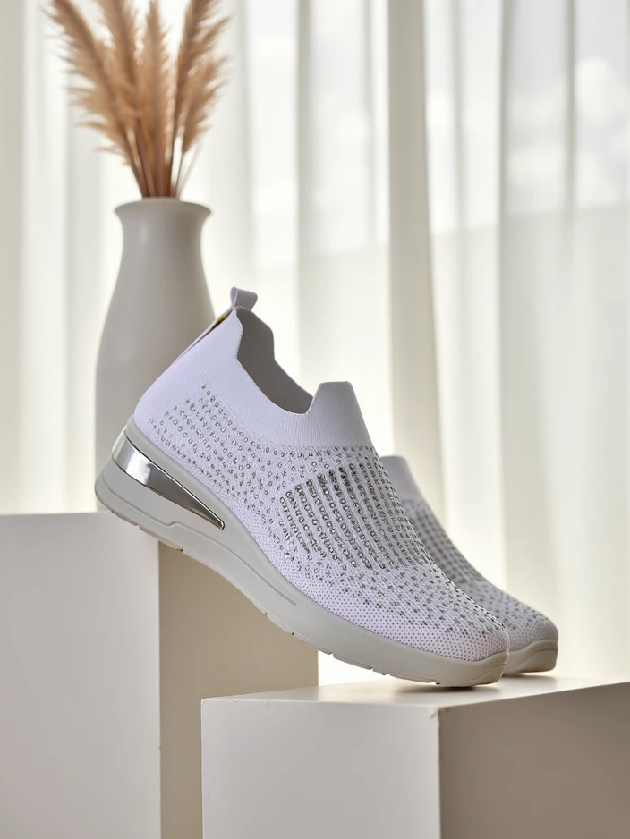 • Modni ženski športni čevlji na wedge iz tkanine, okrašeni z rhinestones. Opremljeni z mehkim tkaninskim vložkom. Vpeti čevlji. Bodo odličen dodatek za vsakodnevne sloge.