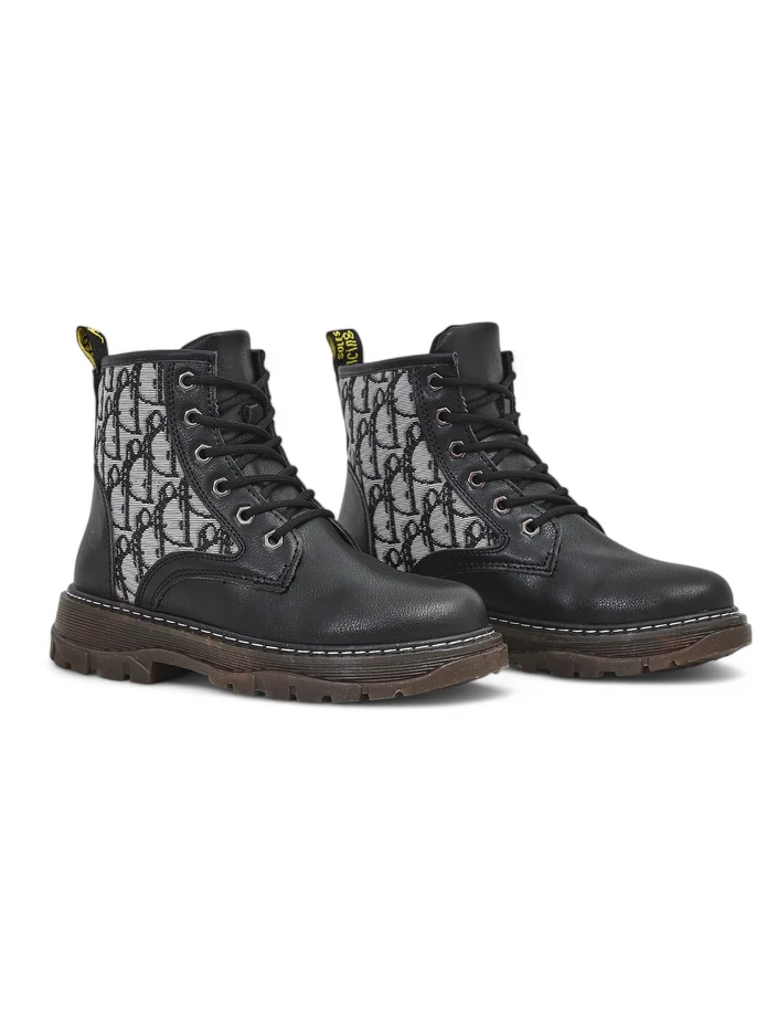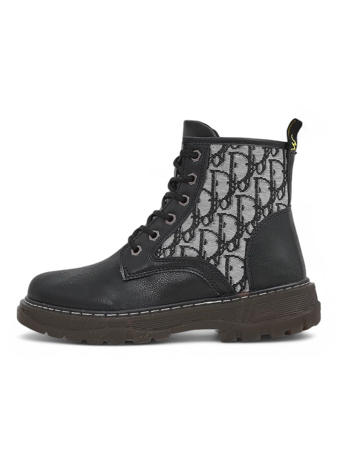 - Odlični ženski gležni čevlji z ravnimi petami, izdelani iz eko usnja in tkanine s potiskom. Notranjost je obložena s tkanino. Model z vezalkami.