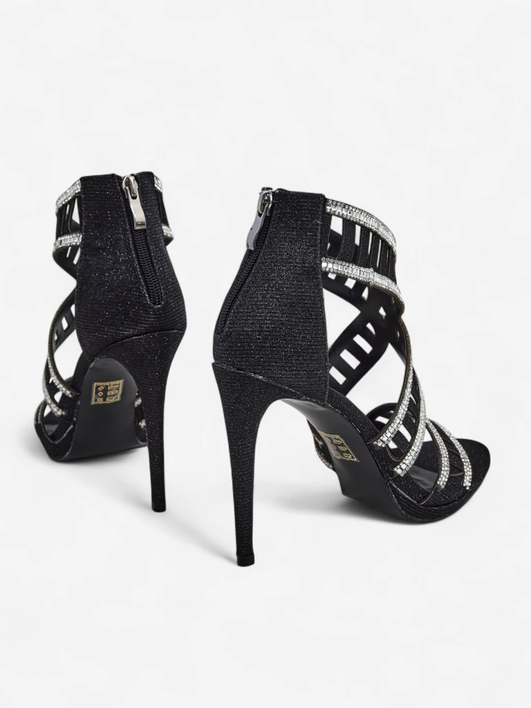 - Sandali na peto izdelani iz eko usnja, blaga in vložka iz eko usnja. Zgornji del je sestavljen iz okrasnih trakov in cirkonov. Kombinacija stila in udobja. Peta doda subtilno eleganco, zadrga pa olajša obuvanje. Popolne za večer!