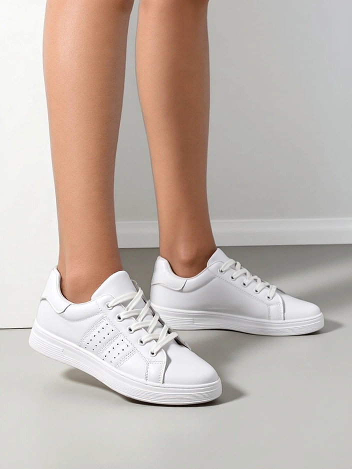 - Elegantni ženski športni čevlji z vezalkami na ravnem podplatu. Zgornji del je izdelan iz ekološkega usnja. Notranji vložek iz blaga. Udobni čevlji za vsak dan!