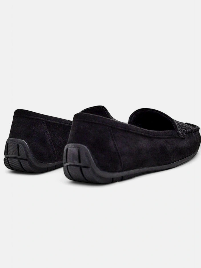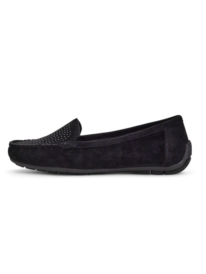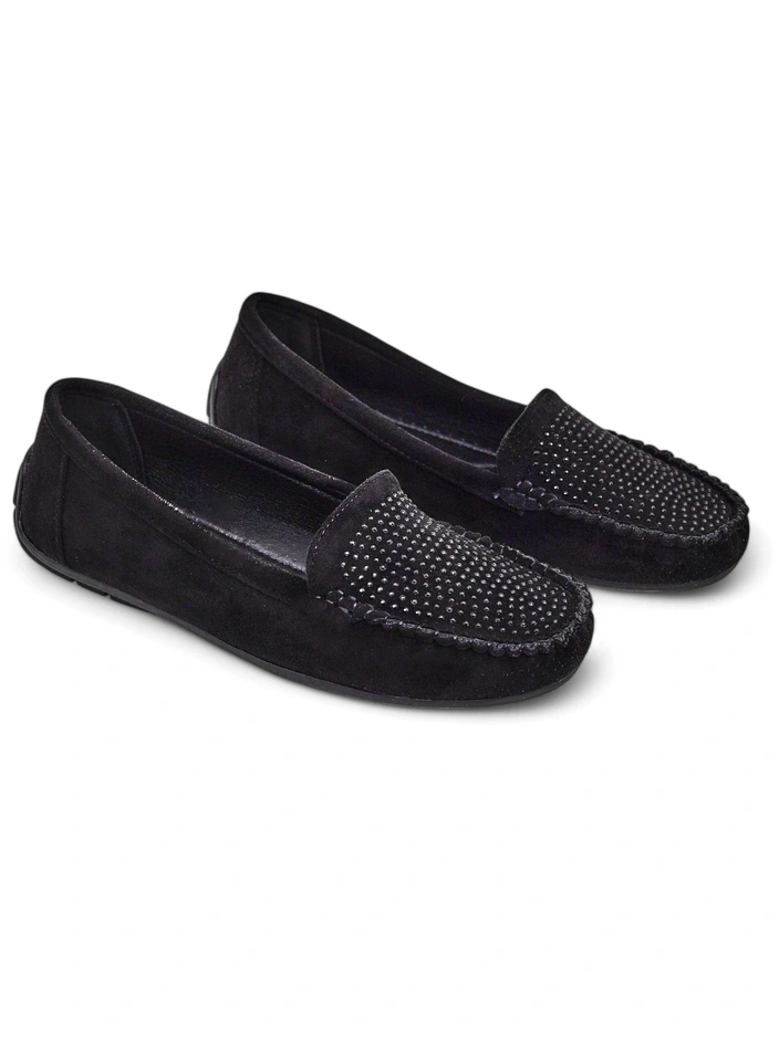 - Lepi ženski loafers s ravnim podplatom. Model ima casual stil in je izdelan iz okolju prijaznega semiša ter ekološke usnjene notranjosti. Prst je okrogel in okrašen s kristali. Idealna osnova za mnoge vsakodnevne videze!