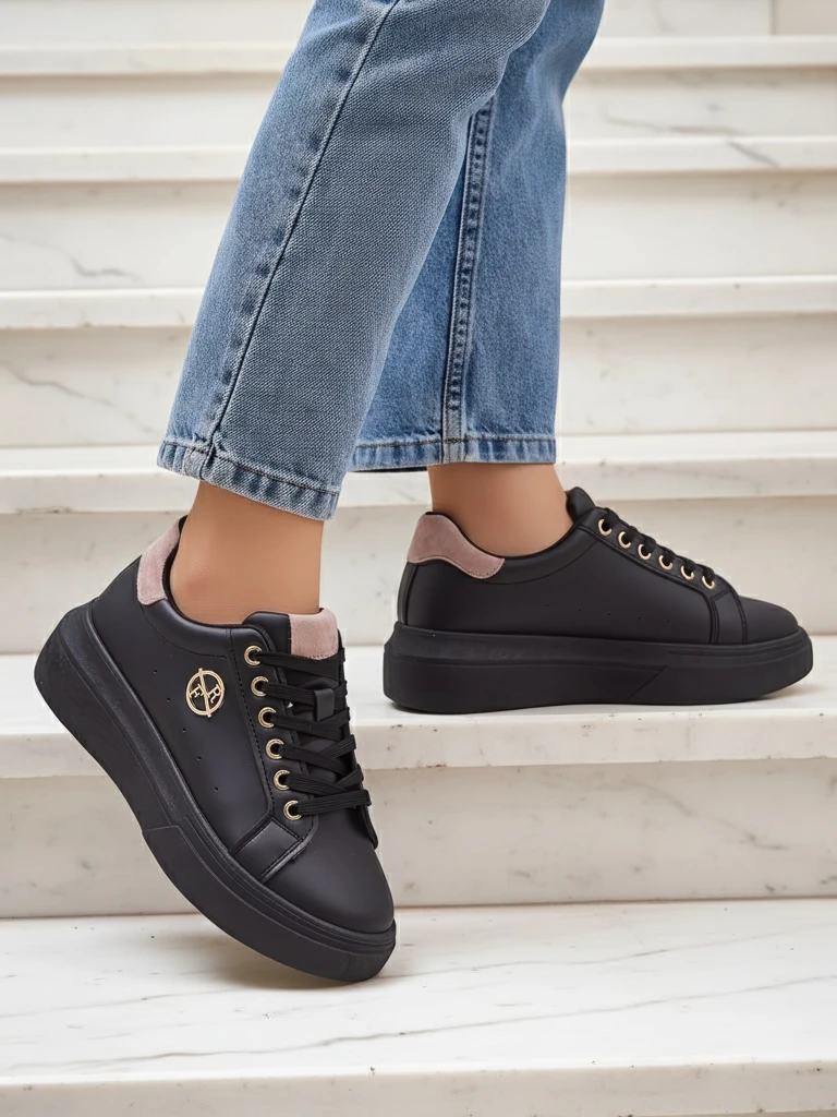 Odkryj sneakersy Erato Nero – wyjątkowe obuwie damskie na platformie, idealne na wiosnę i dla każdej kobiety ceniącej wygodę oraz styl. Wykonane z wysokogatunkowej skóry ekologicznej, połączonej z tkaninową, oddychającą wkładką, gwarantują komfort przez cały dzień. Skóra ekologiczna to nowoczesny materiał, który imituje naturalną skórę przy jednoczesnym szacunku dla zwierząt. Proces produkcji materiału spełnia rygorystyczne normy bezpieczeństwa i ekologii, co potwierdzają międzynarodowe certyfikaty branżowe (np. OEKO-TEX, jeśli dostępne).Buty Erato Nero wyróżniają się klasycznym, czarnym kolorem, złotymi detalami przy sznurowadłach oraz logotypem, które dodają elegancji każdej stylizacji. Platforma o wysokości 5 cm wysmukla sylwetkę, zapewniając stabilność i wygodę dzięki odpowiedniemu wyprofilowaniu podeszwy oraz amortyzującemu wnętrzu. Nowy stan obuwia gwarantuje świeżość oraz najwyższą jakość wykonania.Korzyści z noszenia sneakersów Erato Nero to nie tylko wygoda, ale także uniwersalność – świetnie sprawdzą się zarówno w codziennych, jak i bardziej eleganckich zestawieniach. Delikatna tkanina wkładki chroni stopę przed otarciami, a lekkość konstrukcji zapewnia komfort podczas dłuższych spacerów.3 pomysły na stylizację: 1. Casualowy look: zestaw z jeansami, białym t-shirtem i ramoneską – klasyka na miejski spacer.2. Streetwear: połącz z szerokimi spodniami cargo oraz krótkim topem – modny, młodzieżowy outfit.3. Elegancja na luzie: sneakersy z czarną sukienką midi i oversize’ową marynarką – styl do biura lub spotkanie z przyjaciółmi.Pielęgnacja: Skórę ekologiczną czyść wilgotną, miękką ściereczką lub specjalnymi preparatami przeznaczonymi do tego typu materiału. Unikaj długotrwałego kontaktu z wodą oraz bezpośredniego działania promieni słonecznych, aby nie dopuścić do odbarwień. Przechowuj buty w przewiewnym miejscu, najlepiej w oryginalnym pudełku lub na półce.Trendy: Sneakersy na wysokiej platformie to obecnie jeden z najsilniejszych trendów w modzie ulicznej. Dzięki uniwersalnej kolorystyce i nowoczesnej linii Erato Nero doskonale wpisują się w aktualny klimat modowy, pozwalając na swobodne miksowanie ich w wielu stylizacjach wiosennych.