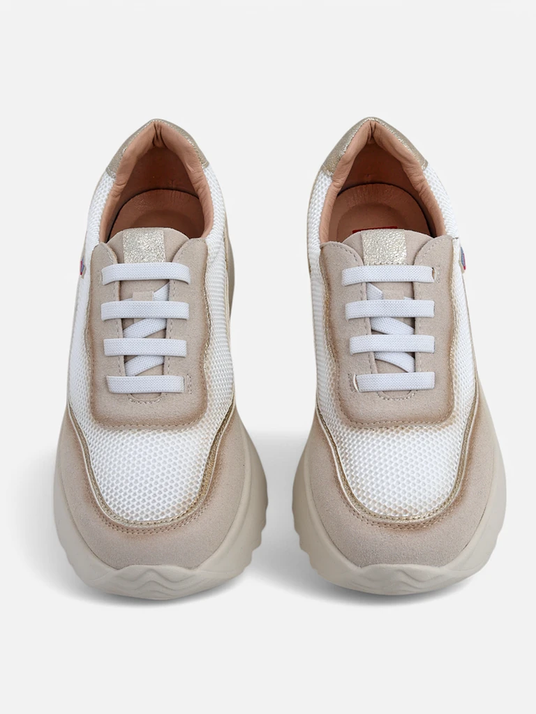 - Modne ženske športne copate z debelejšo podplatom, izdelane iz ekolederja in ekosuede. Znotraj je mehka ekolederinska vložek. Čevlji so vezani. Bodo odličen dodatek za vsakodnevne outfite.