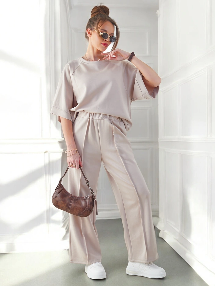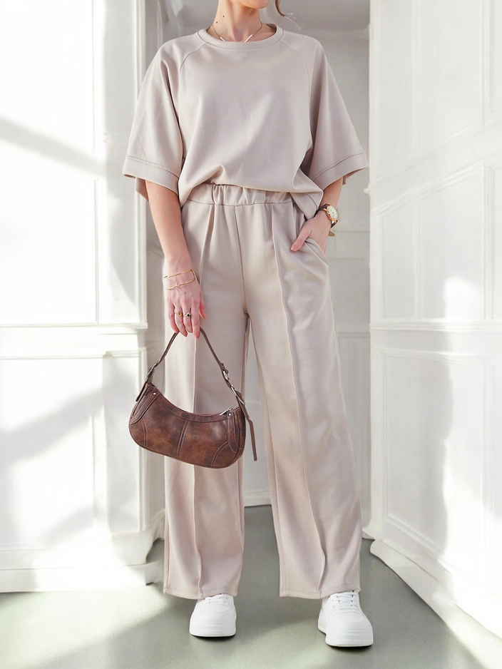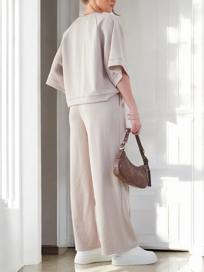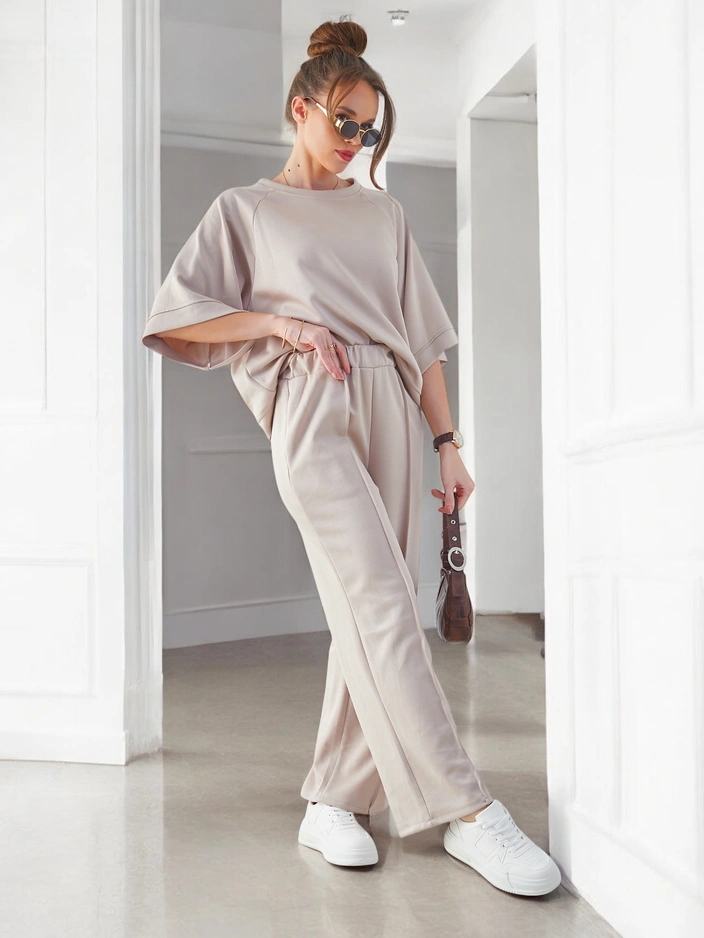 - Ženski sproščen set iz prijetnega materiala. Bluza je v pulover slogu, ima kratke rokave in okroglo dekolte. Široke hlače z elastičnim pasom. Popolno za tiste, ki cenijo udobje.