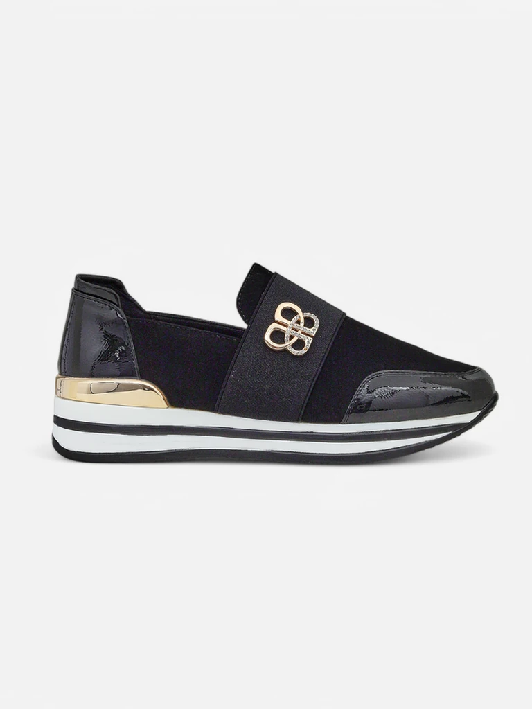 Ženski slip-oni Elektra Nero z zlatim poudarkom, ekološko usnje, 3,5 cm