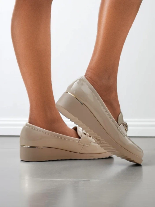 • Lepo ženske mokasinke na nizki peti. Model ima sproščen stil in je izdelan iz ekološke usnje s priročno usnjeno vložkom. Prsti so zaobljeni in okrašeni z zlatimi elementi, ki vsebujejo diamante. Idealna osnova za mnoge vsakodnevne outfite