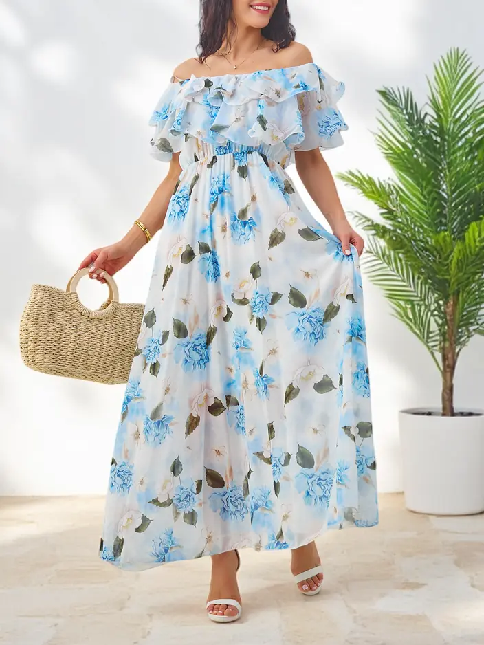 - Ženska obleka brez naramnic s kratkimi rokavi v cvetličnem potisku je lahka in ženstvena izbira za tople dni. Elastični vrh in romantičen kroj poudarjata silhueto, medtem ko žive cvetlice dodajajo svežino in čar. Popolna za poletne sprehode in zabave.