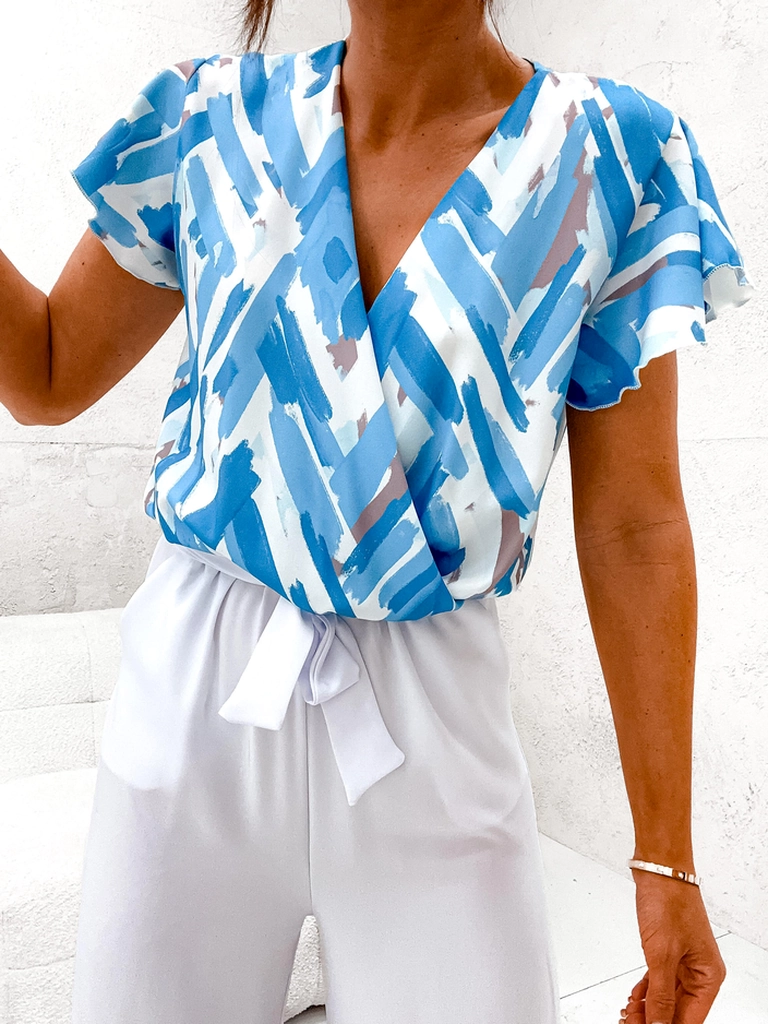 - Očarljiva ženska kombinezonska obleka s kratkimi rokavi, V-izrezom in elastičnim pasom. Model ima široke, dolge noge. Poleg tega je vključen tudi pas. OPOMBA: Natančnost merjenja (+/-) 1 cm.