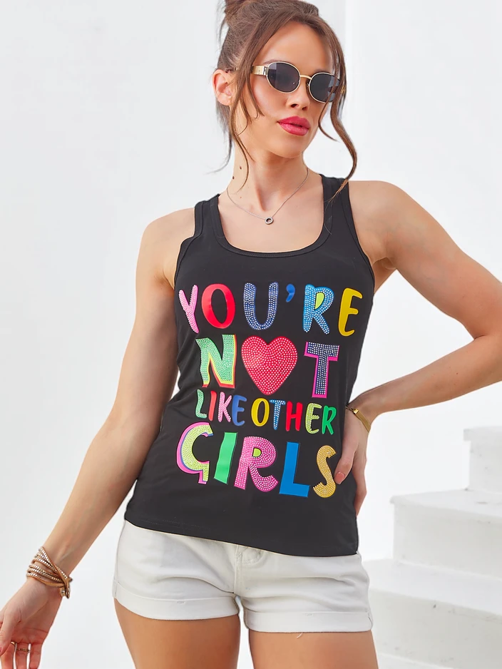 - Ženska bombažna majica brez rokavov s trakovi z unikatnimi potiski, ki združuje udobje s trendovskim dizajnom. Lahka in zračna, popolna za poletne dni in sproščene obleke.