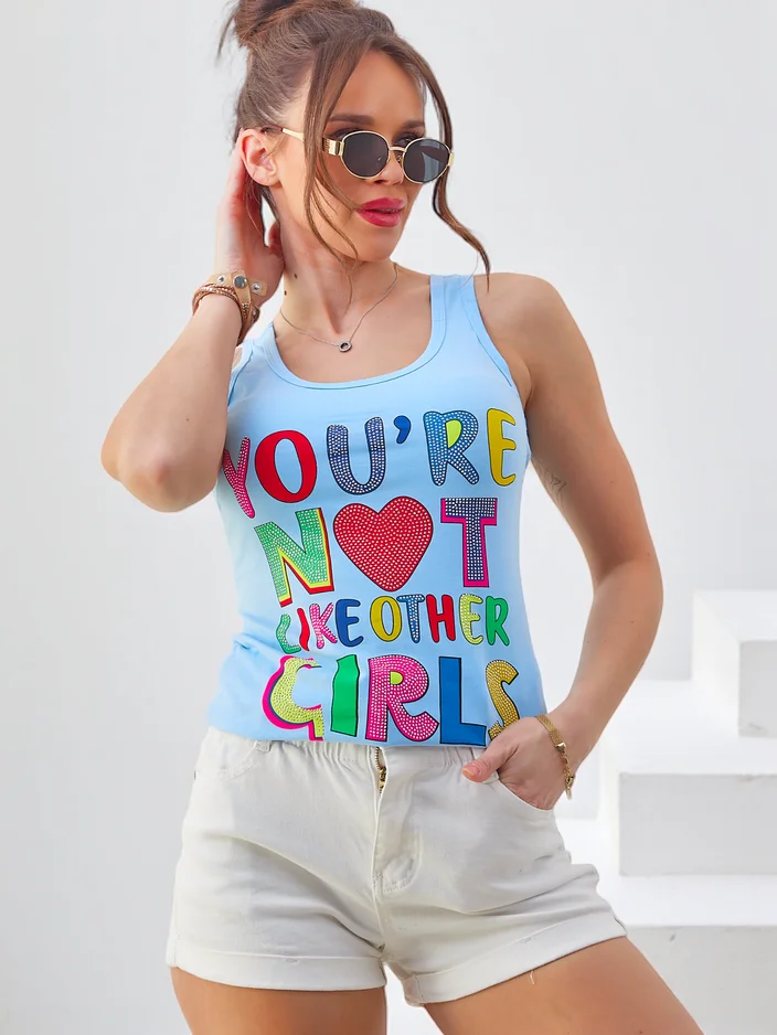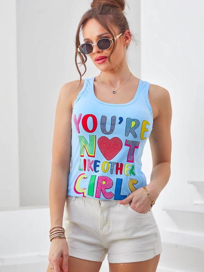 - Ženska bombažna majica brez rokavov s trakovi z unikatnimi potiski, ki združuje udobje s trendovskim dizajnom. Lahka in zračna, popolna za poletne dni in sproščene obleke.