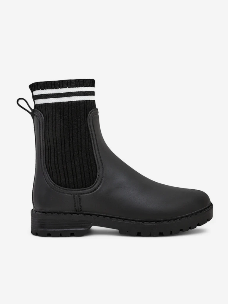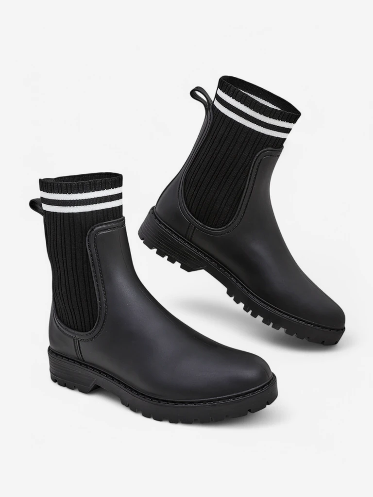 • Klasični ženski dežni čevlji s ravnim peto, narejeni iz gumijastega materiala in višjim tekstilnim vložkom, ki spominja na nogavico. Znotraj je tekstilna podloga. Popolni za pomladne dežne dni!