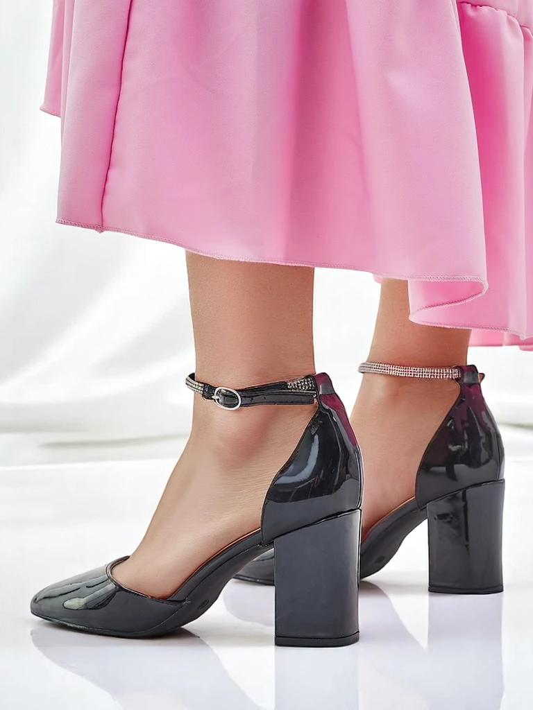 - Elegantne ženske čevlje na blok peti, narejene iz lakiranega ekološkega usnja. Notranjost čevlja je obložena z ekološkim usnjem, koničast nos pa dodaja eleganco! Poleg tega ima dekorativen trak s kristali!
