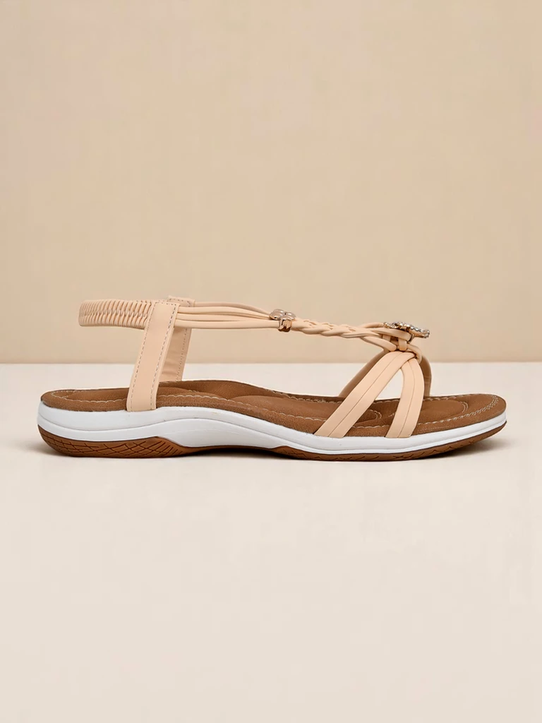- Ženske ravne sandale – popolna ideja za vroče poletne dni. Paščki so narejeni iz udobnega, okolju prijaznega usnja. Sprednji del je okrašen z elegantnimi pletenimi paščki in cirkonijevimi okraski. Natikači.