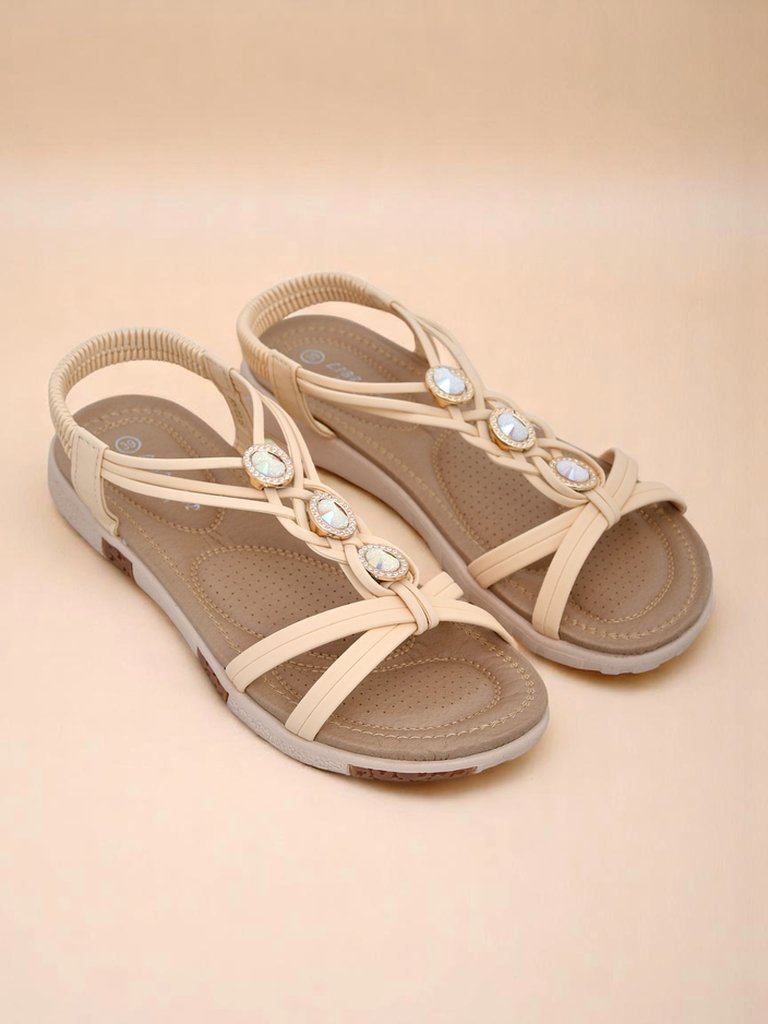 - Ženski sandali z ravnim podplatom so idealna izbira za vroče poletne dni. Trakovi so izdelani iz prijetnega ekološkega usnja. Sprednji del je okrašen z elegantnimi, pletenimi trakovi in okraski iz cirkonov. Obutev je natikana.