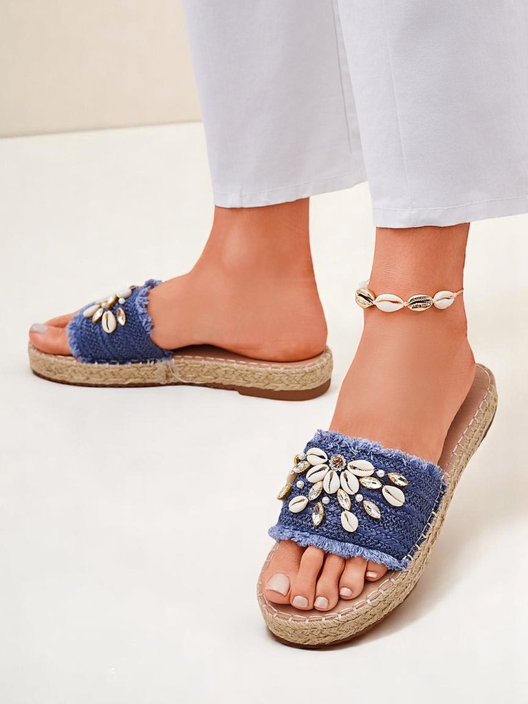 - Ženski natikači z školjkami, izdelani iz blaga, vložka iz eko usnja in podplata, okrašenega z jutovo vrvico – stil in udobje za poletje.