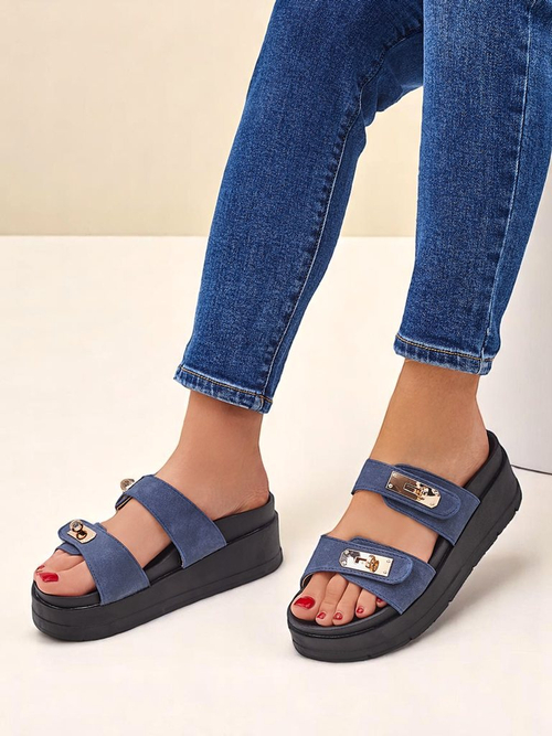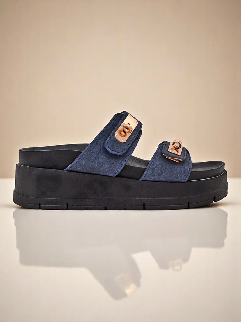 Natikači Aurelia so poosebljenje poletnega sloga in udobja. Izdelani so iz visokokakovostnega usnja, ki zagotavlja mehkoto in udobje pri nošenju ves dan. Trden, debel podplat iz umetne mase zagotavlja stabilnost in blaži udarce, skrbi pa tudi za zdravje vaših stopal. Zlati kovinski detajli dodajajo natikačem eleganco in prefinjenost, temno modra barva pa se poda k številnim poletnim kombinacijam.