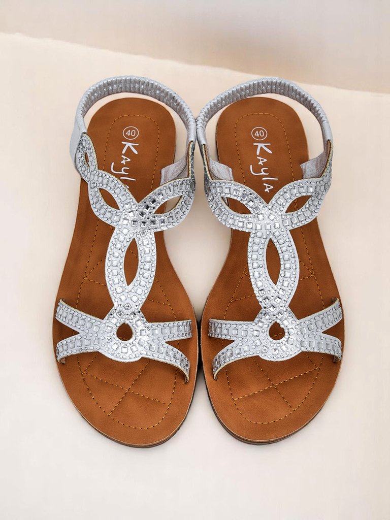 - Ženske sandale z ravnim podplatom iz eko usnja, okrašene s paščki z okrasnimi kamenčki. Združujejo udobje in diskreten sijaj, popolne za poletne dni in večerne izhode.
