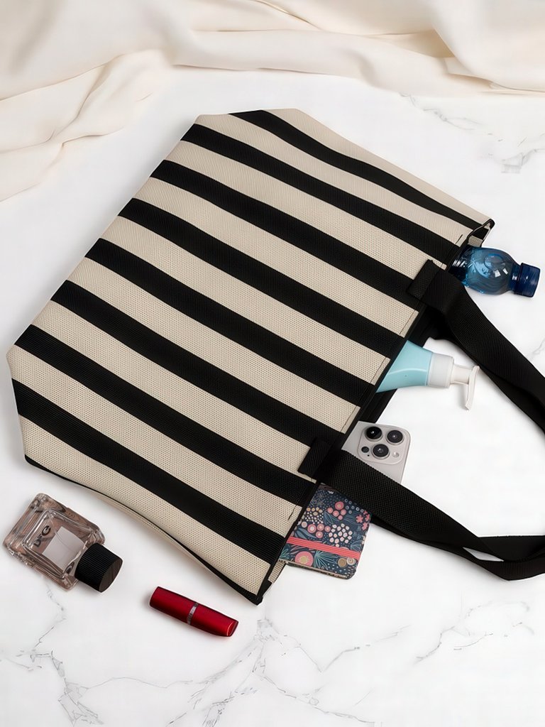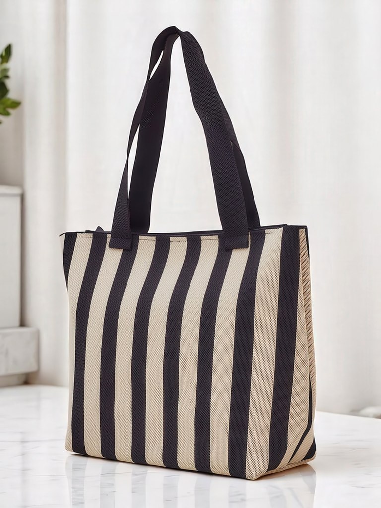 - Velika ženska torba iz blaga s klasičnim črtastim vzorcem. 1 predal, zapiranje na zadrgo. Lahka, prostorna in moderna – popolna za nakupovanje in vsakodnevne sprehode!