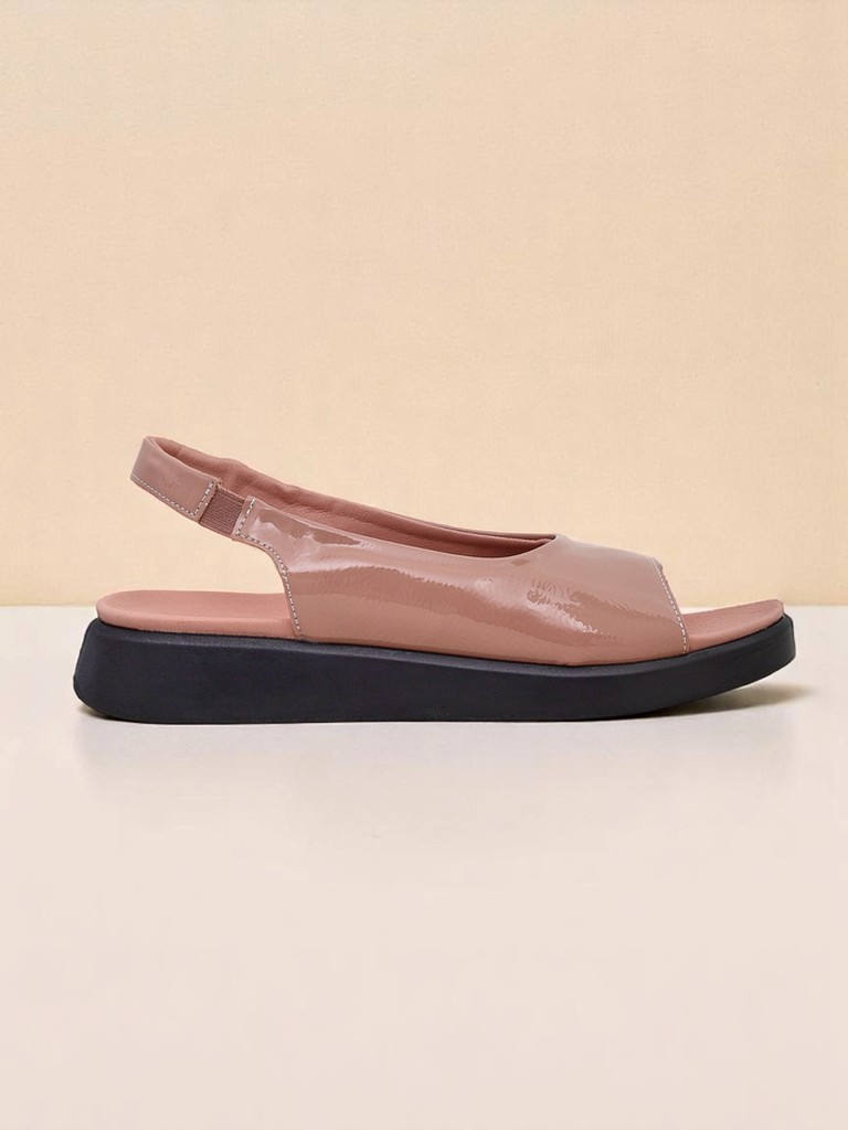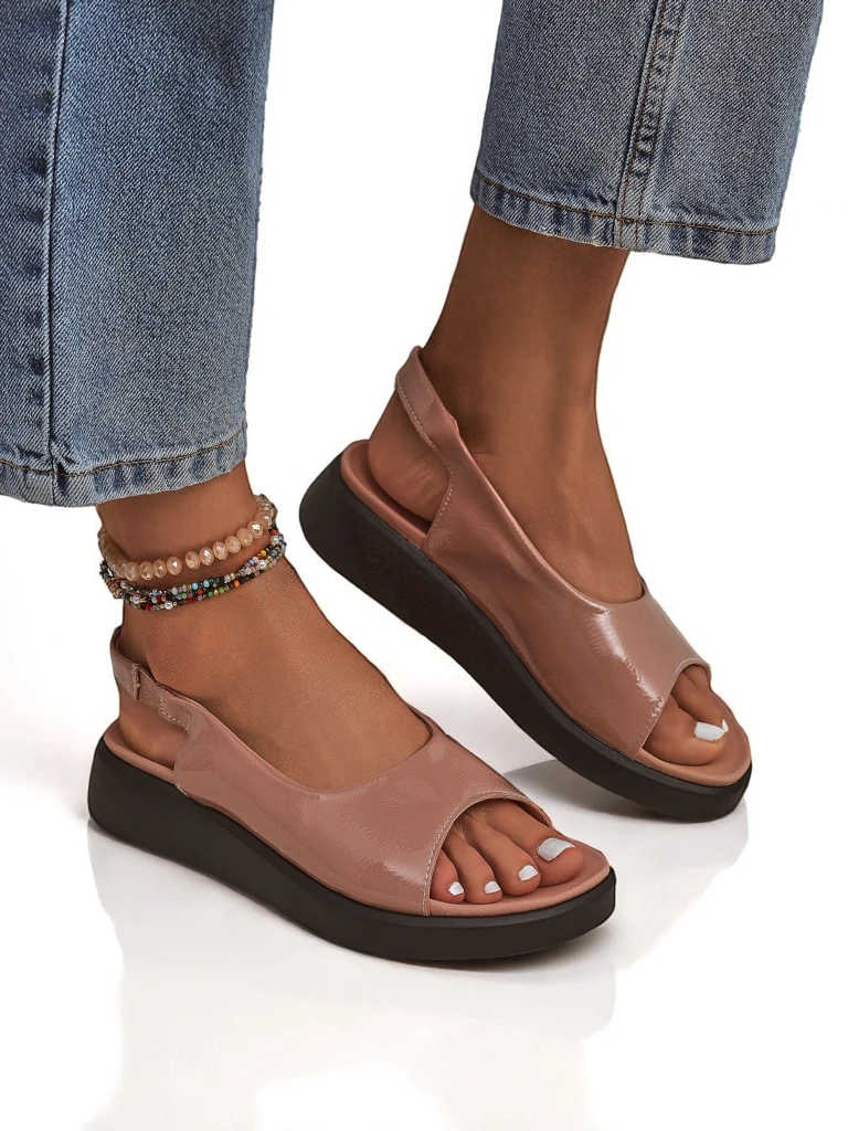 - Eleganten sandali z debelejšim podplatom iz sijočega eko usnja. Model na natikanje združuje udobje z modernim videzom – idealen za poletne dni in večere.