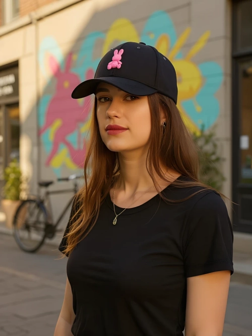 - Očarljiva kapa zanjo, okrašena s stilskim zajčjim našitkom. Nastavljivo zapiranje zagotavlja udobje, ženski dizajn pa doda značaj vsakemu outfitu.