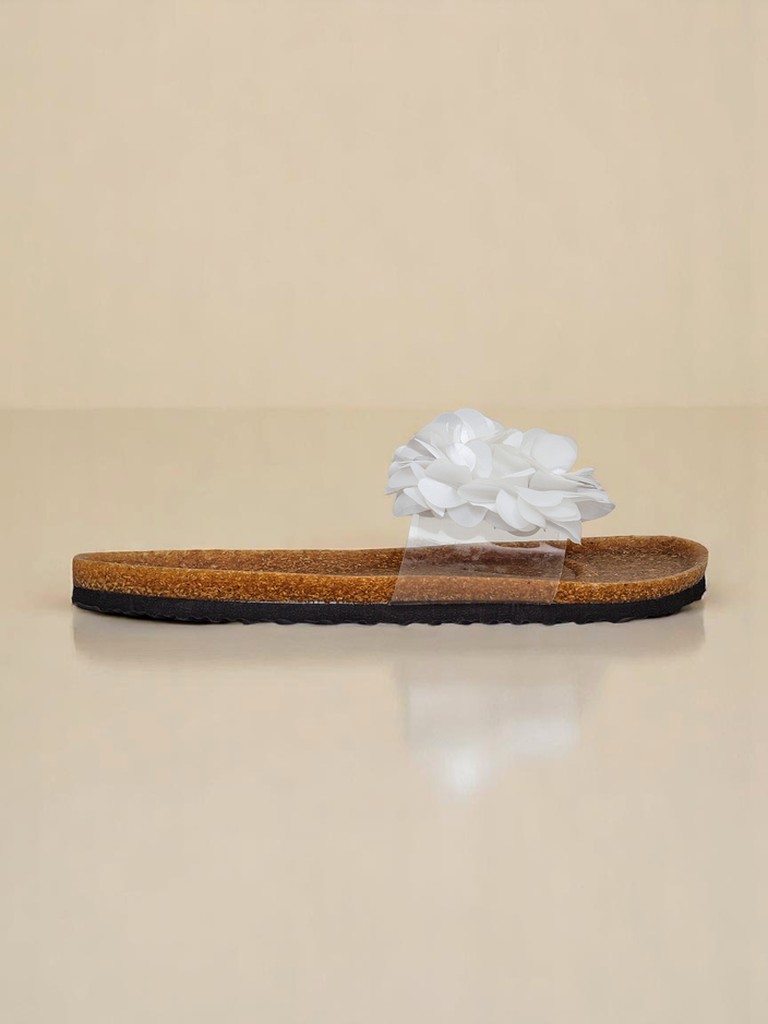 - Očarljivi natikači z ravnim gumijastim podplatom in okrasnimi cvetlicami na traku. Idealni za poletje – lahki, udobni in ženstveni. Dajo čar vsakemu videzu.