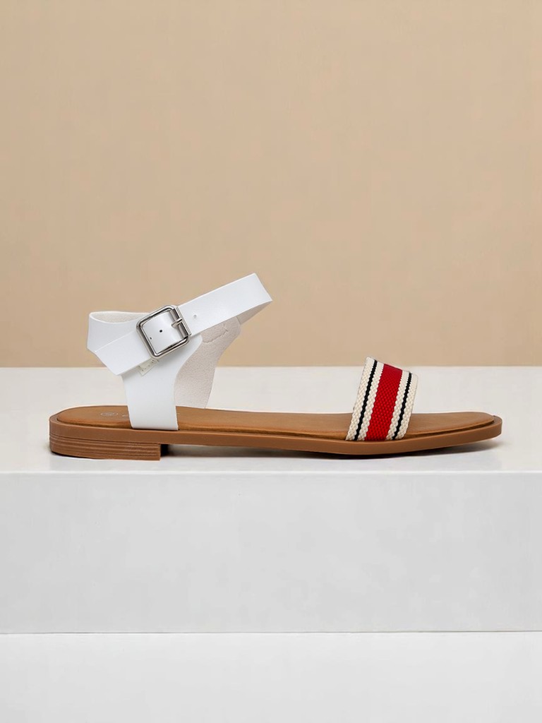 - Elegantni sandali z ravnim podplatom iz mehkega umetnega usnja. Trak iz blaga doda lahkotnost, zaponka pa zagotavlja udobno prileganje vsak dan.