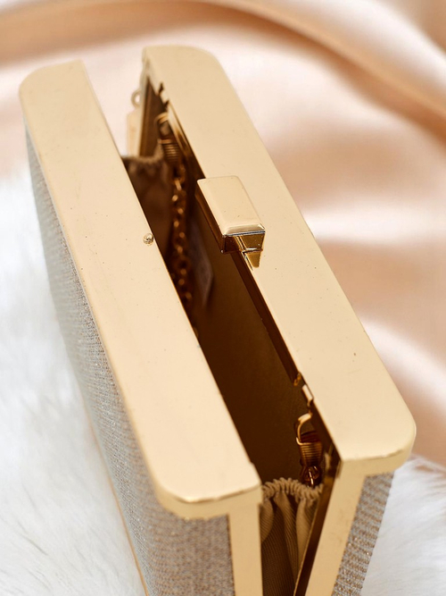 - Majhna torbica-ovojnica z bleščečo tkanino, zaprta s pritiskačem. Priložen ima odstranljiv trak – lahko jo nosite v roki ali na rami. Popolna za večer, poln bleščavosti in elegance!