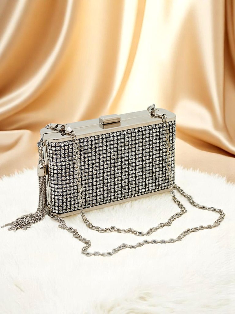 - Večerna torbica z okrasnimi kamenčki, zapiranje na pritiskač. Majhna, elegantna, z odstranljivim paščkom—nosite jo v roki ali na rami. Doda sijaj vsaki opravi!