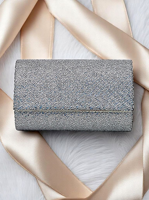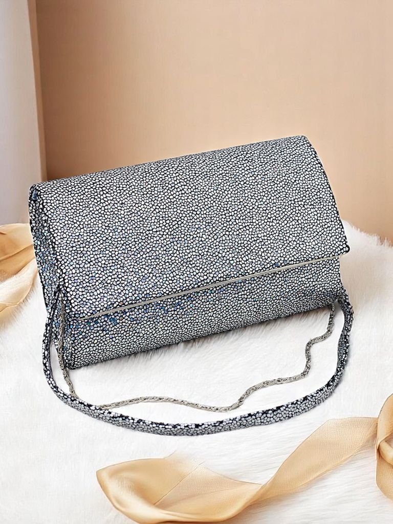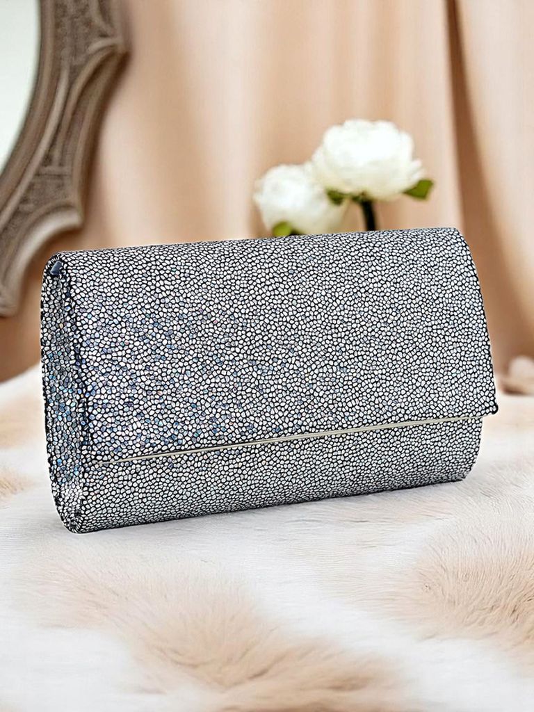- Elegantna torbica iz eko usnja, prekrita z debelo bleščečo tkanino. Zapiranje na magnet, z odstranljivim paščkom – popolna za večerne izhode in posebne priložnosti.
