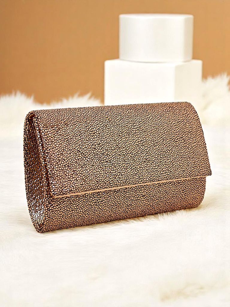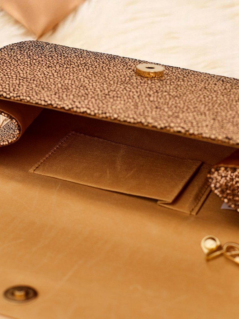 - Elegantna torbica iz eko usnja, prekrita z debelo bleščečo tkanino. Zapiranje na magnet, z odstranljivim paščkom – popolna za večerne izhode in posebne priložnosti.