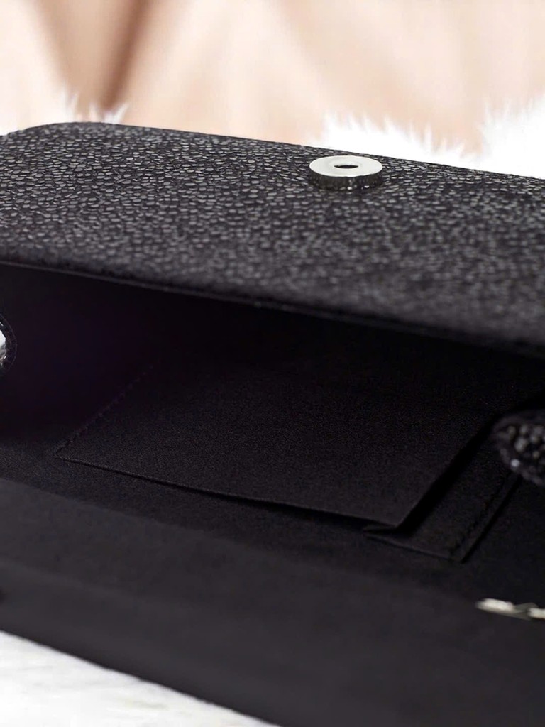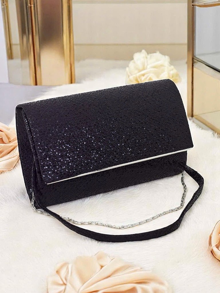 • Elegantna torbica iz eko usnja, prekrita z debelo bleščečo tkanino. Zapiranje na magnet, z odstranljivim paščkom – popolna za večerne izhode in posebne priložnosti.