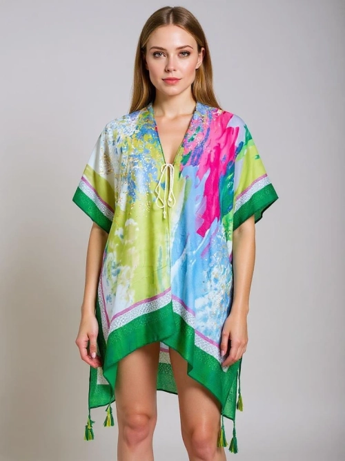 - Poletna tunika za na plažo, tipa pareo, z V-izrezom in asimetričnim spodnjim robom je eleganten 'must-have' za počitnice. Zračna, lahka tkanina in učinkovit vzorec poudarjata ženstvenost, ohlapen kroj pa zagotavlja udobje v vročih dneh. Idealna za na plaž