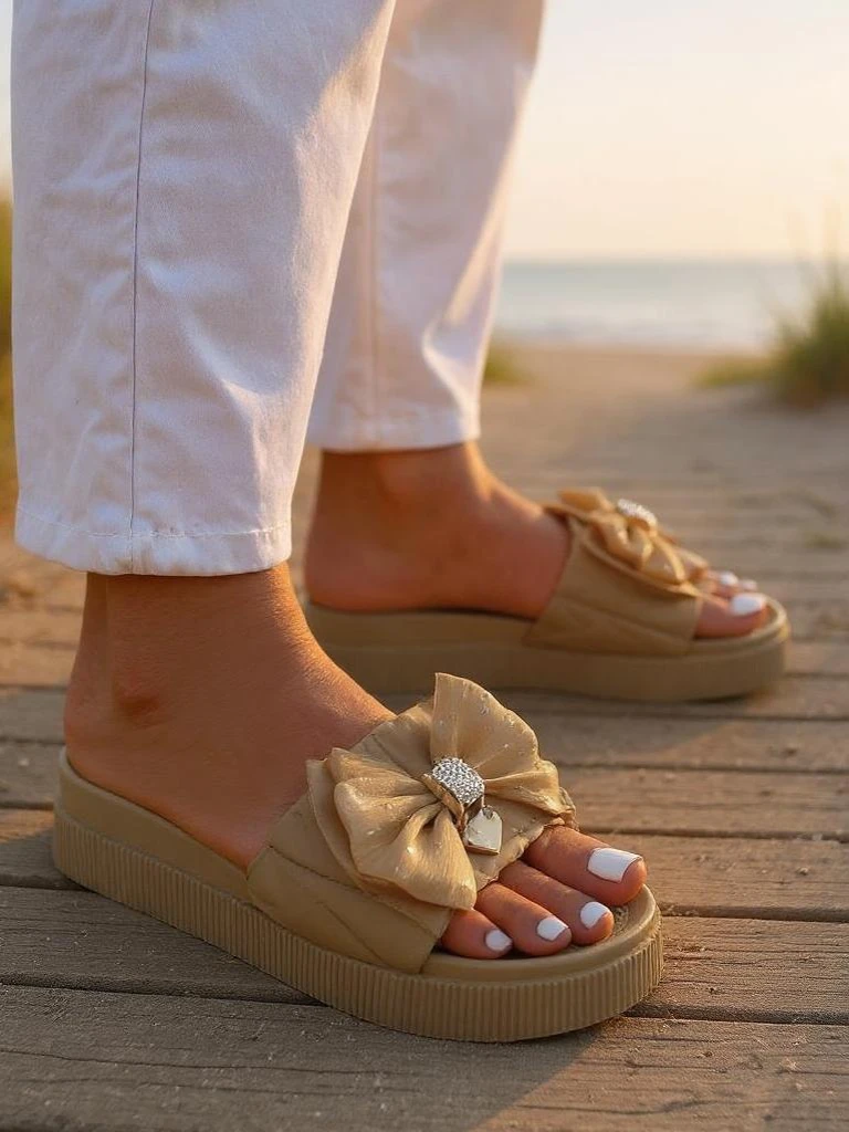 - Ženski natikači na laganoj gumenoj platformi, idealni za letnje dane. Kaiš od eko kože, ukrašen divnom mašnom, dodaje devojački šarm. Udobni, elegantni i ženstveni – odličan izbor za svakodnevne izlaske i opuštene odmore.