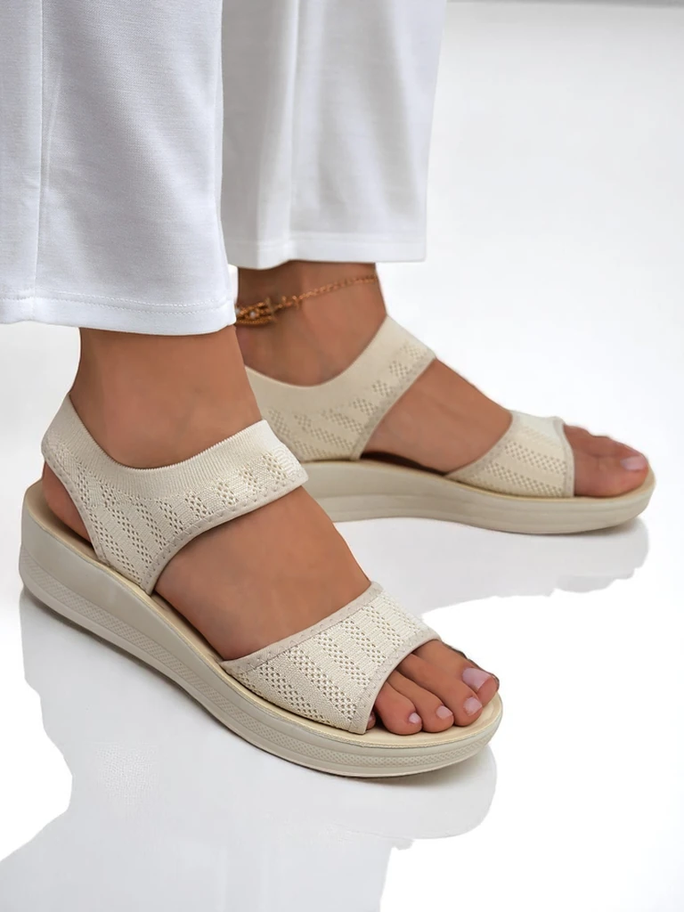Sandali Luminosa so elegantni in izjemno lahki sandali s platformo, ki združujejo brezčasno klasiko in moderno tehnologijo izdelave. Zgornji del je izdelan iz visokokakovostnega poliestrskega pletiva, ki diha in ni le odporen na raztezanje in deformacije, temveč zagotavlja tudi neprimerljivo zračnost stopal tudi v najbolj vročih dneh. Podplat s platformo iz pene EVA zagotavlja lahkotnost in odlično blaženje – vaši koraki bodo mehki in samozavestni ves dan. Vsi materiali so bili skrbno izbrani za vaše zdravje in udobje ter ustrezajo standardom certifikatov OEKO-TEX®. Sandali ne vsebujejo škodljivih snovi in so varni tudi za občutljivo kožo. Za dizajn je značilna minimalistična oblika in širok velcro, ki omogoča enostavno prilagajanje čevlja obliki stopala. Podloga je izdelana iz mehkega, hipoalergenega sintetičnega materiala, ki je nežen na dotik in preprečuje odrgnine. Najpomembnejše prednosti sandalov Luminosa so lahkotnost, zračnost in izjemno enostavno vzdrževanje. Ustvarjajo edinstven občutek svežine v vročih dneh, anatomska oblika podplata pa podpira udobje med dolgimi sprehodi. Stilski navdihi: 1. Casual videz: Kombinirajte sandale z belimi lanenimi hlačami in pastelno majico – idealna izbira za sprehod po mestu ali nakupovanje. 2. Poletna eleganca: Kombinirajte sandale z lahkotno, zračno midi obleko in veliko nakupovalno torbo za srečanje v kavarni. 3. Športni vibe: Nosite jih s kratkimi hlačami in preveliko majico – obleka za počitniški izlet ali aktiven dan na prostem. Navodila za nego: Sandale nežno očistite z vlažno krpo z dodatkom blagega mila, izogibajte se pranju v pralnem stroju. Sušite stran od virov toplote, da ohranite elastičnost materiala. Shranjujte v suhem prostoru, po možnosti v originalni škatli. Trendi: Odprta paleta bež in bele barve ter odprta tekstura so trenutno zelo moden element poletne obutve. Platforma nudi dodatno udobje in se odlično prilega urbanemu, ležerno sproščenemu stilu.