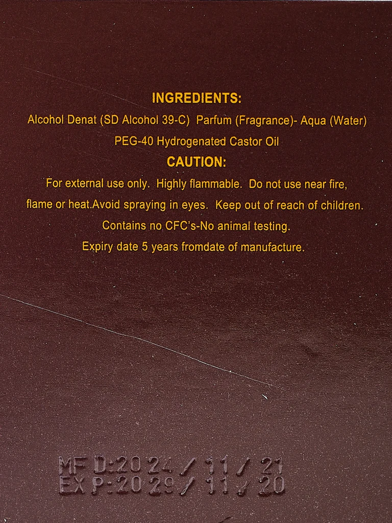 - Senzualen parfum, ki združuje svežino mandarine in jabolka s cimetom ter globoko srce tobaka in mire. Vse skupaj je ovito v toplo osnovo pačulija in tonka fižola. Eleganca in značaj v eni kompoziciji.