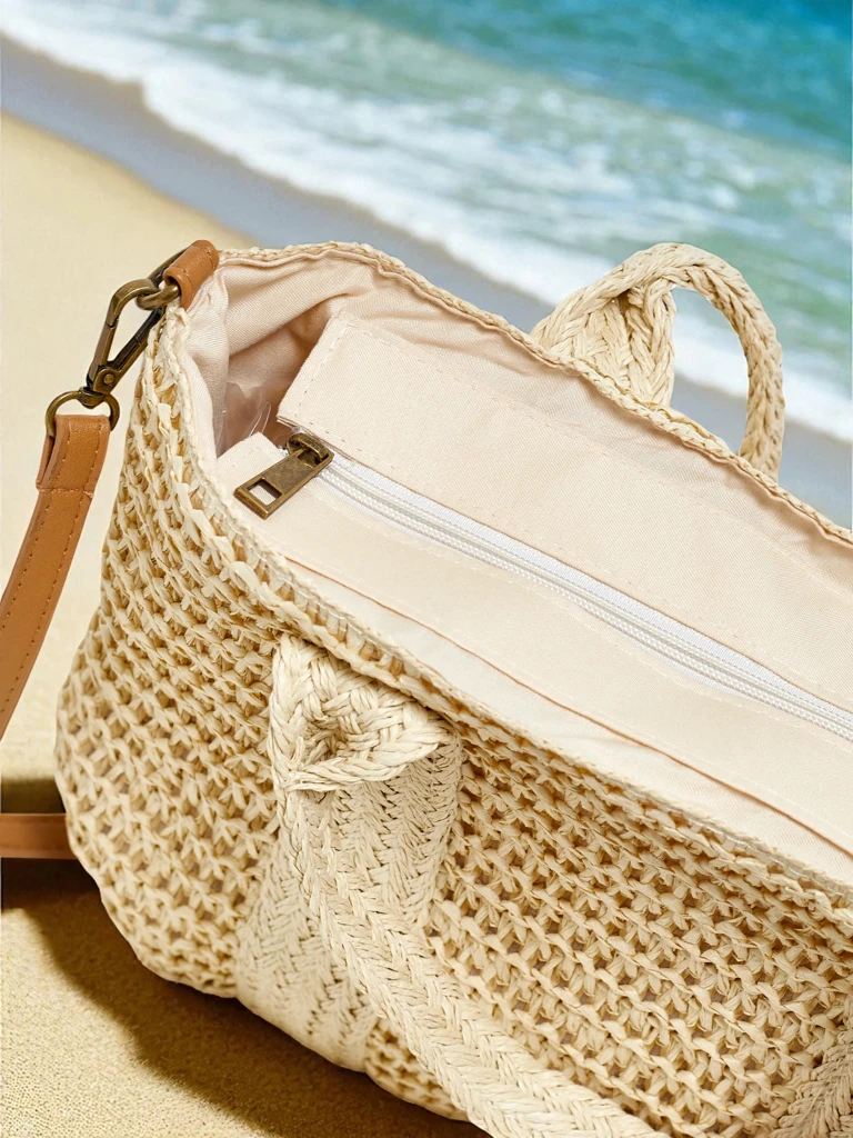 - Elegantna torba iz slame z enim velikim predalom in žepom, zapiranje na zadrgo. Lahka in prostorna, idealna za poletne dni. Popolna za vsakodnevne modne kombinacije, zagotavlja udobje in urejenost ter hkrati ohranja modni, počitniški čar. Popolna za na pl