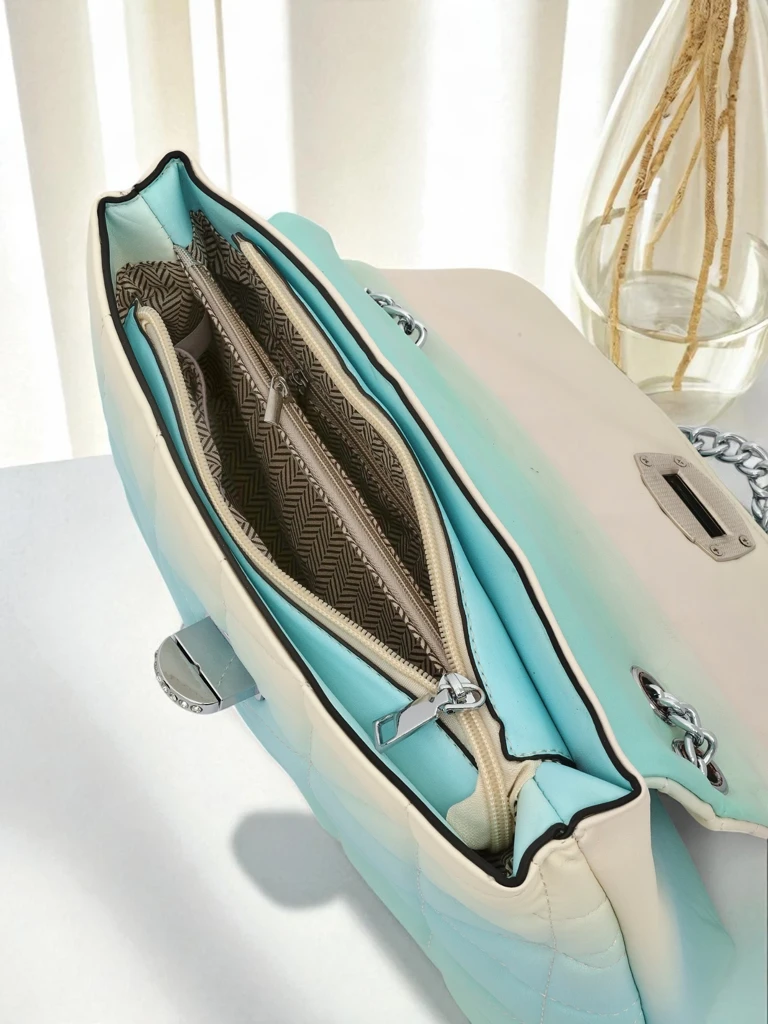 - Elegantna kuverta-torbica iz eko usnja z ombre učinkom. Zapira se z zadrgo in pritiskačem. Kovinska veriga namesto naramnice doda pridih elegance. 1 predal, popolna za najpomembnejše stvari za večerni izhod in posebne priložnosti.