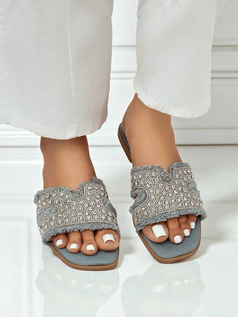 • Ravni ženski sandali iz eko usnja, okrašeni s svetlečimi kamenčki. Modni in udobni, popolni za poletje in posebne priložnosti. Dodajo sijaj vsakemu outfitu in nudijo celodnevno udobje.