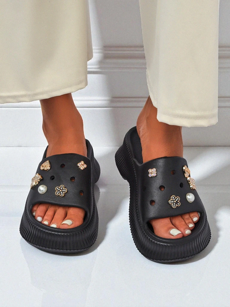 - Elegantne ženske natikače z okrasjem na debelejšem gumijastem podplatu združujejo udobje in moderen videz. Popolne za poletje — lahke, trpežne in s svojimi detajli privlačne na pogled. Odlične za plažo, mesto in vsakodnevne izlete.