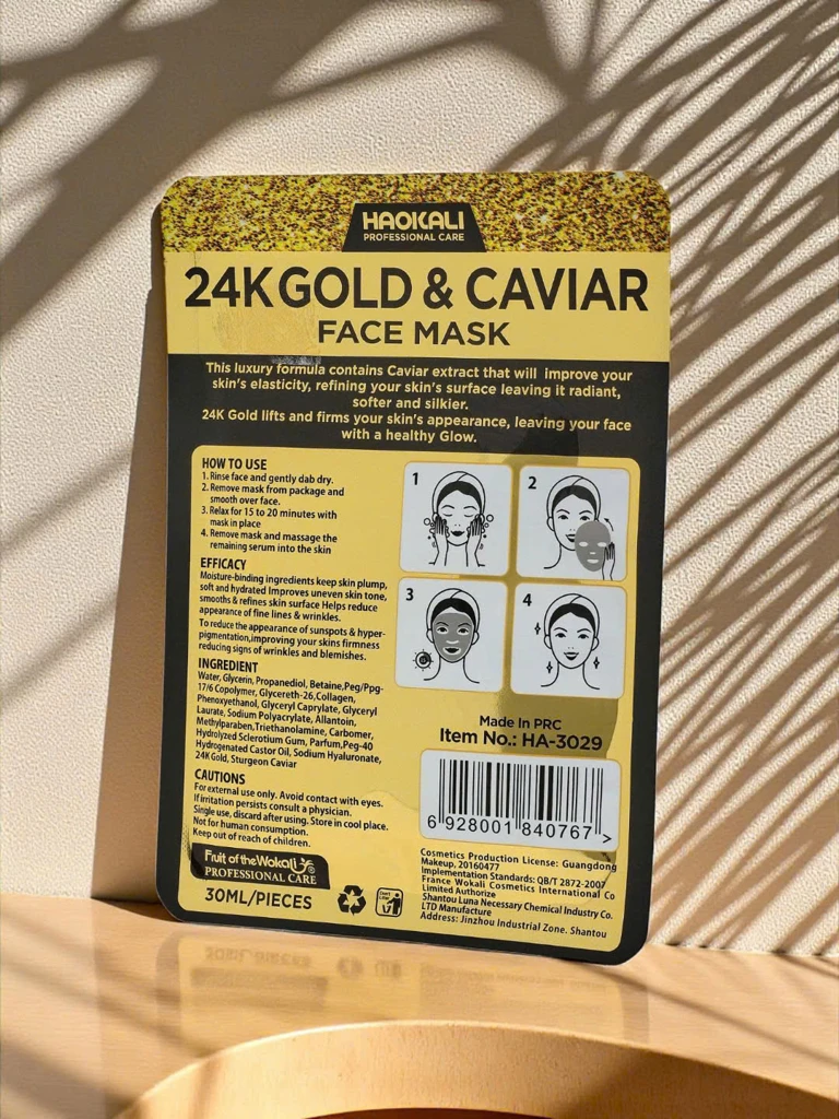 - Maska za obraz z 24K zlatom in kaviarjem – intenzivna nega, učvrstitev in osvetlitev kože. Gladi, vlaži, izboljšuje elastičnost in obnavlja. Ščiti pred staranjem in blaži draženje. Idealna za nego zahtevne kože.