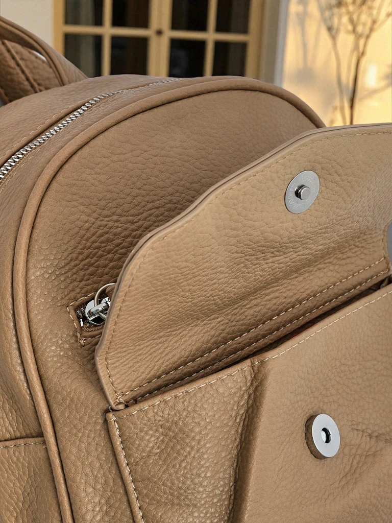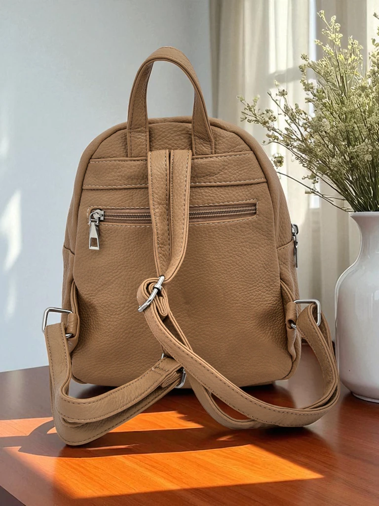 - Kompakten nahrbtnik iz eko usnja z enim predelkom in tremi žepki za drobnarije. Nastavljivi trakovi zagotavljajo udobno nošenje. Eleganten, lahek in praktičen, idealen za mesto, univerzo in vsakodnevne izlete.