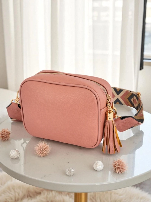 - Eleganten majhen nahrbtnik iz eko usnja s pisanim trakom in očarljivo resico. 1 predal, 2 žepa, nastavljiv in odstranljiv trak. Idealen za vsak dan in za izlete – kompakten, a sprejme vse, kar je pomembno.